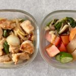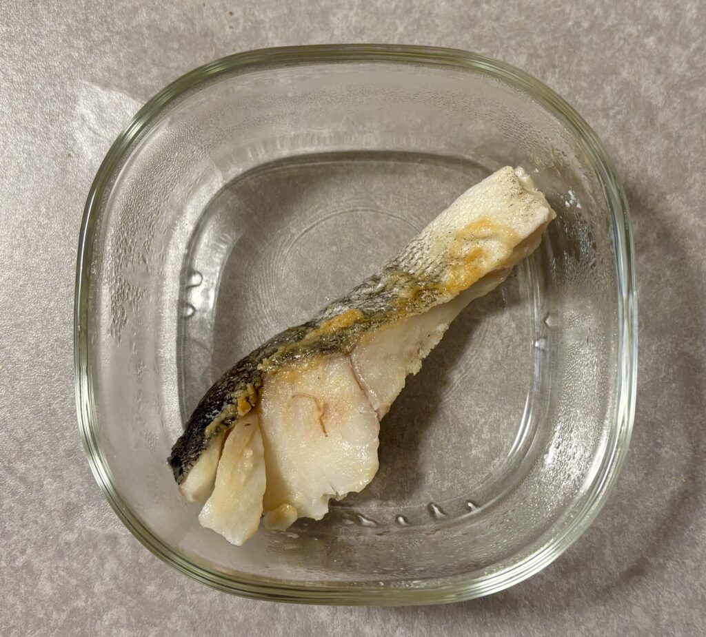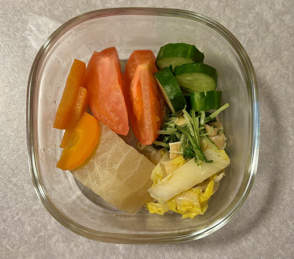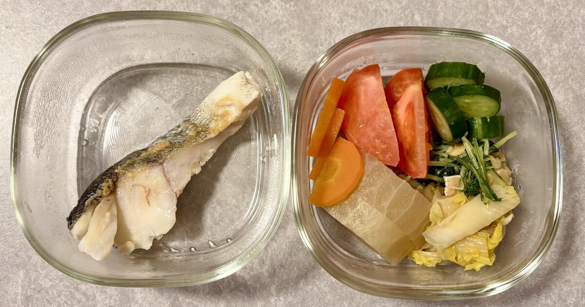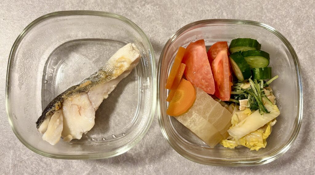 上記の写真のメニューは朝にまとめて作り、1人分ずつガラス容器に小分けにし、夜ご飯まで冷蔵保存するつもりでこの形にしました。食べる時は、副菜はそのまま、主菜の魚は電子レンジで加熱していただきます。ご飯は炊飯器にたけているものをよそい、今回はこれに小分けパックの豆腐をだして冷奴も食べました。
