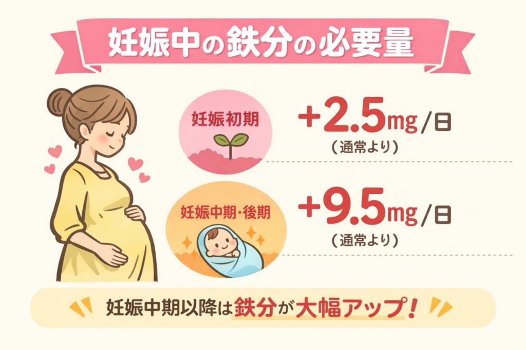 妊娠中は血液量が増え、赤ちゃんの成長にも鉄分が使われるため、普段より多くの鉄分が必要になります。